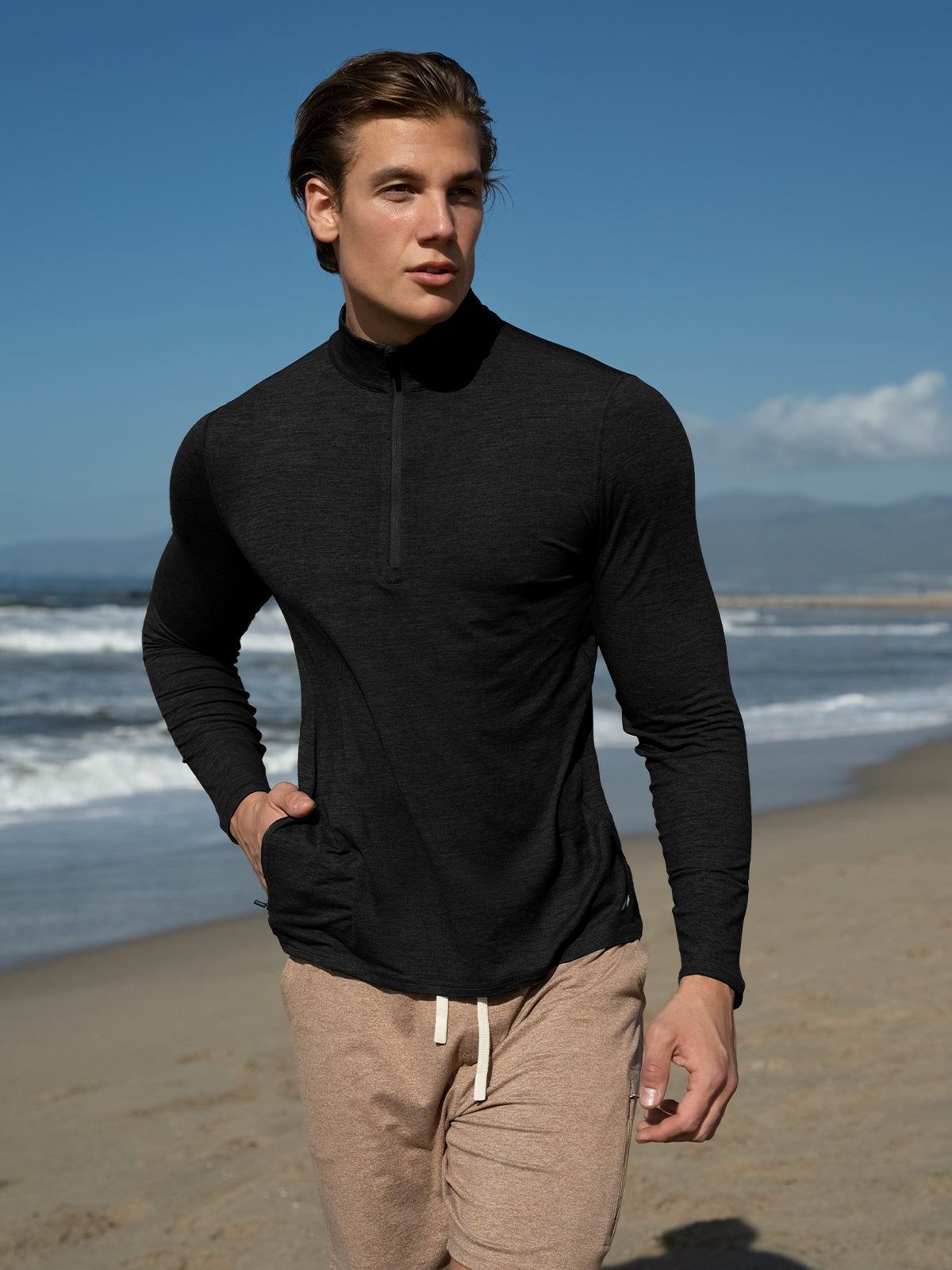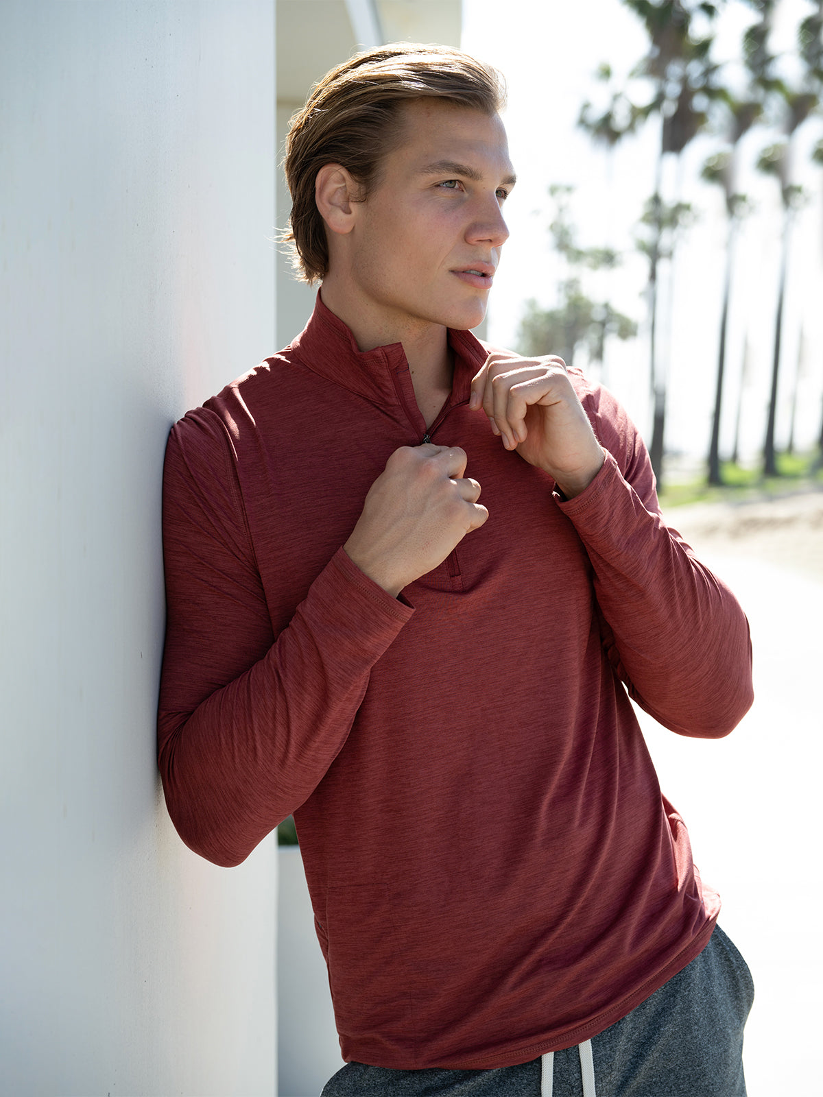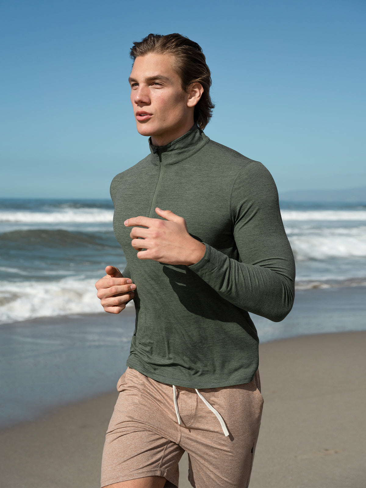 We created this men's top using four-way stretch, breathable fabric to provide maximum comfort and flexibility during activity. The mock collar and half-zip closure envelop the neck for extra warmth, while the moisture-wicking material keeps the wearer cool and dry. Functional details like the zippered side pocket and reflective logo were added for utility and style. Flat-lock seams prevent skin irritation during repetitive motions, making this the ideal top for active pursuits.