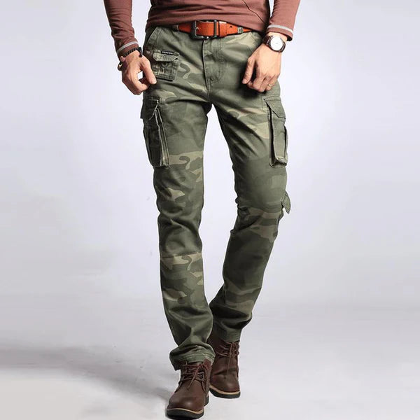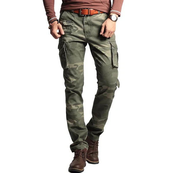Cargo pants are the ultimate staple, both in the past and for the future. They are ready for any job. These stylish and durable work pants are crafted from robust tear-resistant cotton fabric, enhancing durability and abrasion resistance. With a vintage woodland camouflage print and military-style details, they also look incredibly rugged.