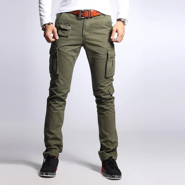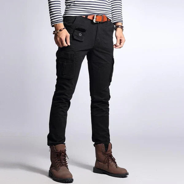 Introducing our Men's Solid Multi-pocket Cotton Slim Cargo Pants – a perfect fusion of style and functionality tailored for the contemporary man.