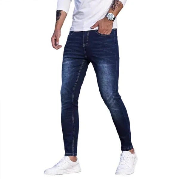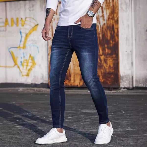 Upgrade your wardrobe with our Men's Distressed Calf Stretch Denim Trousers and experience the perfect blend of style and comfort for any occasion.